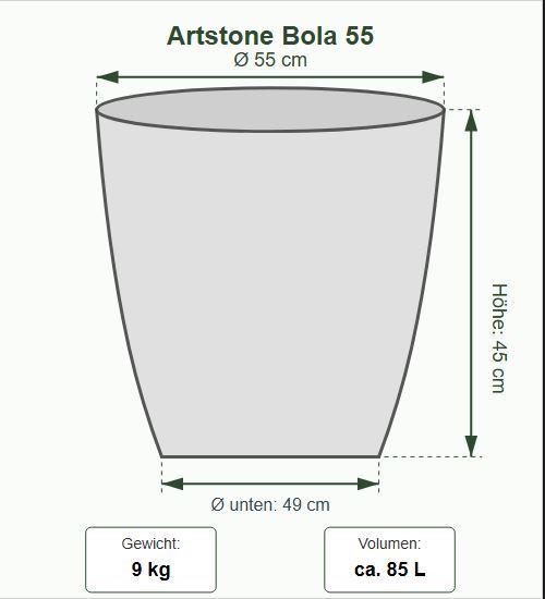 Der Artstone Bola mit Ø55 cm ist der Gigant unter den leichten Pflanzkübeln. Mit seinem Volumen von 90 Litern bietet er genug Platz für große Palmen oder Olivenbäume, wiegt dabei aber dank Kunststoff-Stein-Gemisch nur 9 kg. Die Farbe Schwarz in Marmor-Optik wirkt besonders edel auf hellen Terrassenplatten.