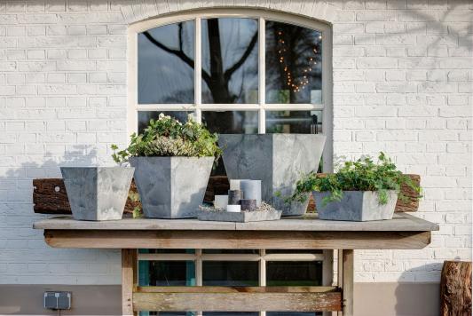 Die Ella Serie umfasst quadratische Pflanzgefäße von 15 cm bis 45 cm sowie passende Balkonkästen und Divider. Je nach Modell sind die Töpfe in Schwarz, Grau, Braun und Cloudy erhältlich.