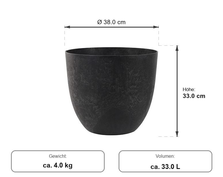 Artstone Bola rund Schwarz D38 H33 - frostfest, mit Wasserspeicher, dabei leicht. Zeitloser Blickfang für Balkon & Terrasse.