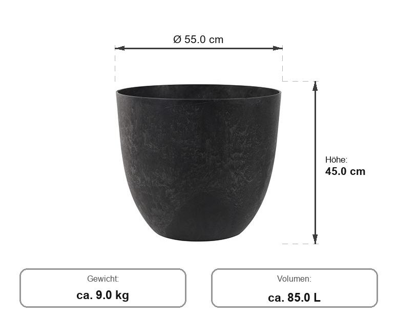 Artstone Bola Topf Schwarz D55 H45 - frostfest, Wasserspeicher inklusive, trotz Grïöße leicht. Statement-Topf für Outdoor & Indoor.Terrassenplatten.